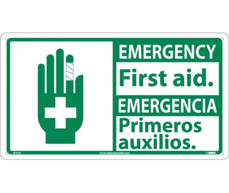 As an Amazon Associate, we earn from qualifying purchases. Emergency First Aid Sign, Bilingual, Rigid Plastic NATIONAL-MARKER-COMPANY . SFA1R Gallery Attributes Brand name, Manufacturer name, ManufacturerNATIONAL-MARKER-COMPANY Attribute00First Aid Sign Attribute01Rigid Plastic Attribute02, colorGreen on White Attribute03, AttributeKey04Message Attribute04EMERGENCY - FIRST AID/EMERGINCIA - PRIMEROS AUXILIOS Attribute05English<BR />Spanish Attribute0610 in Attribute0718 in Attribute080.05 in Attribute09+183 ?F Attribute10Mounting Holes Attribute11Indoor Attribute12Rectangle Attribute13OSHA 29 CFR-1910.145 Attribute141 per Each AttributeKey00Type AttributeKey01Material AttributeKey02Color AttributeKey03Message or Graphic AttributeKey05Language AttributeKey06, height_AttribHeight AttributeKey07, width_AttribWidth AttributeKey08Thickness AttributeKey09Application Temperature Rating AttributeKey10Mounting Type AttributeKey11Special Features AttributeKey12Shape AttributeKey13Compliance/Standards AttributeKey14Package Quantity DimensionUnitinch KnownMan, Extra Product NameEmergency First Aid Sign, Bilingual, Rigid Plastic height10.0 moq, multiple, tierMinQty11 MPNSFA1R qtyInStockAvailable SKU20508RP1018 tierPrice144.05 width18.0 Distributor offers SellerSKUMOQIn stockMultiplePrices hantover.com20508RP10181Available11 @ $44.05