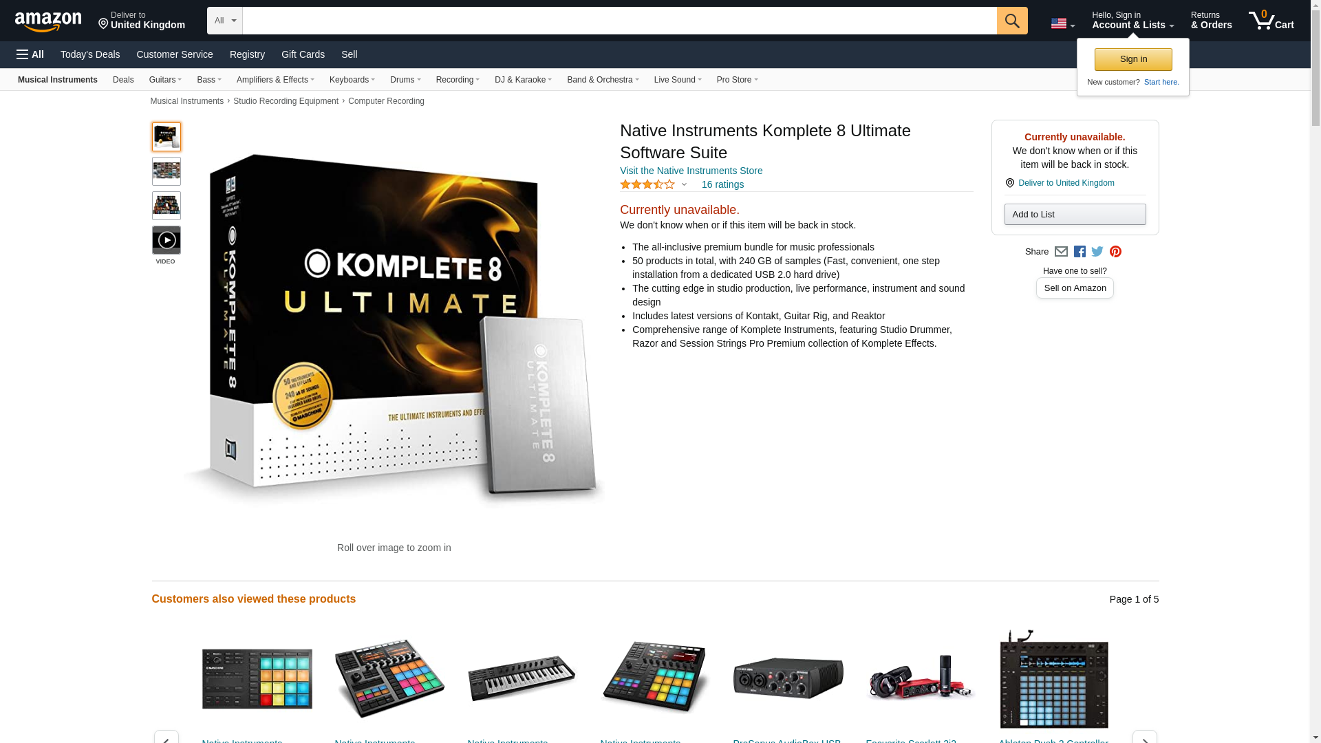 Native Instruments KOMPLETE 8 ULTIMATE is a premium bundle for modern music production, live performance, and sound design, and the last word in NI excellence.KOMPLETE 8 ULTIMATE provides a total of 50 outstanding musical tools: The updated flagships KONTAKT 5 and GUITAR RIG 5 PRO set completely new standards, alongside the powerful synthesis of REAKTOR 5.6. Brand-new stars like STUDIO DRUMMER, TRANSIENT MASTER, SESSION STRINGS PRO, the SOLID MIX SERIES, and VINTAGE COMPRESSORS join the ranks next to NI classics such as MASSIVE, ABSYNTH and ALICIA S KEYS.NIs KOMPLETE 8 ULTIMATE weighs in at 240 GB of premium sound content - which is why it comes on its own dedicated, sturdy USB 2.0 drive. Setup everything in one go, by simply installing KOMPLETE 8 ULTIMATE to your chosen internal or external drive. Without the lengthy DVD installation process, you can have KOMPLETE 8 ULTIMATE up and running easily.KOMPLETE 8 ULTIMATE has got it all, but Native Instruments is constantly releasing exciting new products. Thats why when you register KOMPLETE 8 ULTIMATE, you will receive a $30 e-voucher towards any additional KOMPLETE Instrument or Effect.KOMPLETE 8 ULTIMATE is fully integrated with MASCHINE, the groove production studio from Native Instruments. Instantly load any of the instruments or effects from KOMPLETE 8 ULTIMATE (or any other VST or AU plug in) into your MASCHINE project for complete real-time control. Together, MASCHINE and KOMPLETE 8 ULTIMATE make a powerhouse partnership for any studio. Get your Native Instruments Komplete 8 Ultimate Virtual Collection today from Sam Ash Direct and enjoy the confidence that comes from fast, free shipping, the guaranteed lowest price and our 45/60-day return/price protection policy.
