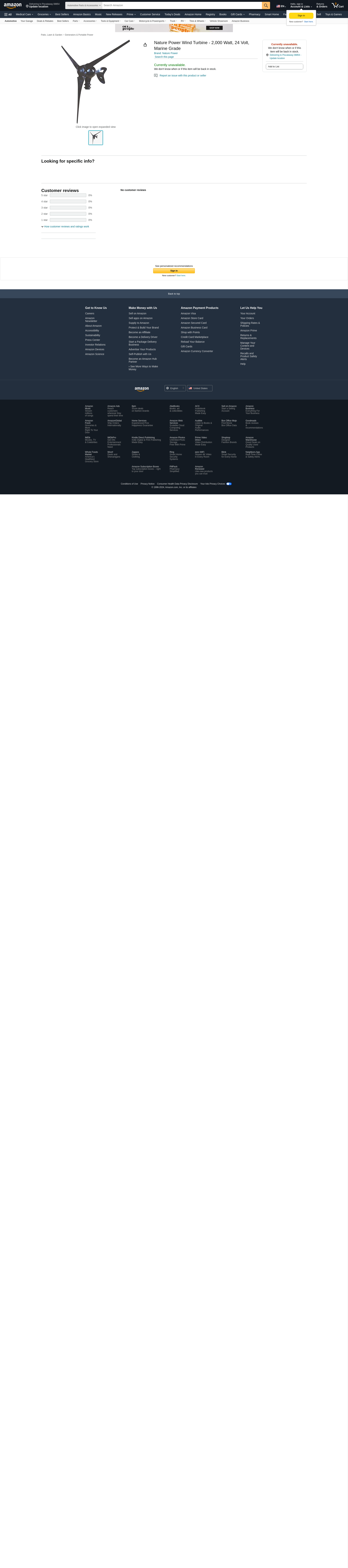 The Nature Power 2,000 Watt Marine Grade Wind Turbine efficiently harnesses wind energy day and night. 2,000 Watt max power is reached at 45 MPH wind speed. Some assembly required. Assembly Required Yes, UL No, Weather Resistant Yes, Watts 2,000, Rotor Size ft. 5 13/16, Electrician Required No, Product Style Land/marine, Speed MPH 7 mph start up, Blade Material Carbon fiber, Overspeed/Overcrank Shutdown Yes, Volts 24, Material Type Diecast aluminum, Blade Diameter in. 69 29/32, Dimensions L x W x H in. 32 x 22 x 20, Mount Type Schedule 80 steel pipe. All-weather, high-quality marine-grade coating and construction provides versatility in both land and sea environments Begins to supply power at a very low 7 MPH wind speed, so even if the wind dies down, your power won't Maintenance-free design features an industrial-strength die-cast aluminum body with carbon fiber composite blades that are engineered for low-noise operation Maximum Power Point Tracking MPPT Smart Controller varies voltage-to-current ratio for the most efficient charging Overspeed/overcrank shutdown prevents damage in high wind conditions Automatic regenerative electromagnetic braking system keeps the unit operating within proper mechanical and electrical limits without manual intervention Compact size in relation to supplied power, with a 53 Watts/lb. power/weight ratio Mounts on any 1.5in. Schedule 80 steel pipe - optional tower mounting kit Item# 121072 sold separately Model Number: 70702. Size: 2. Age Group: Adult.
