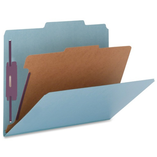 Eco-friendly classification folders are durable and made for subdividing large, bulky legal-size files. 2" fasteners are embedded on the front and back panels as well as the divider, expand for a 2" capacity and keep papers secure and in order. Covers are made of 25 point stock and have 2/5-cut right of center tabs. The dividers are made of 20 point stock and have 1/3-cut tabs. Top tab folders are made with recycled material.