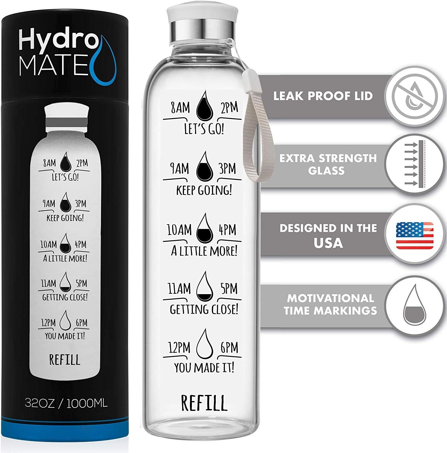 HydroMATE 32 Oz Motivational Glass Water Bottle with Time Marker | Leak Proof | BPA-Free | Track Intake & Drink More Water Daily | Safe For Travel To-Go & Hot Liquids | 1 Liter (White)