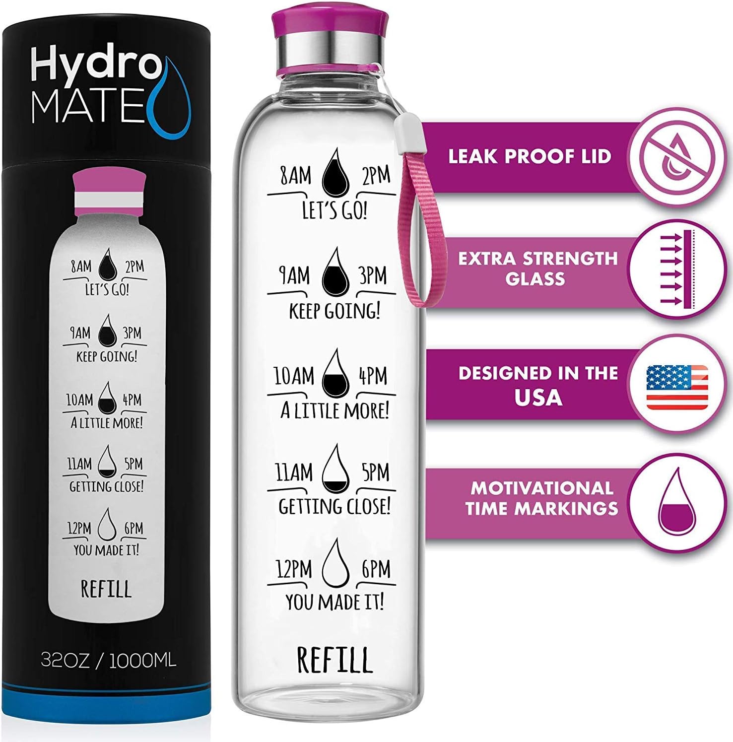 HydroMATE 32 Oz Motivational Glass Water Bottle with Time Marker | Leak Proof | BPA-Free | Track Intake & Drink More Water Daily | Safe For Travel To-Go & Hot Liquids | 1 Liter (Purple)