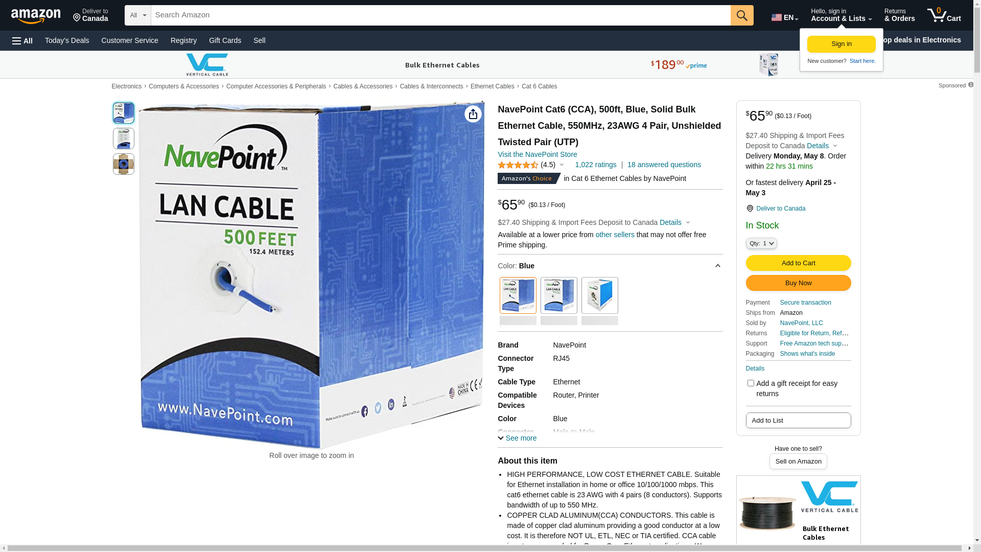 NavePoint's Category 6 CCA UTP Bulk Ethernet Cable is the perfect solution for wiring your home or office. This cable is designed to provide superior performance for your high bandwidth applications including computers, routers, VoIP phones, IP cameras, printers, gaming consoles, routers, ethernet extenders, and switch boxes. Made from professional grade materials, this cable is available in a variety of lengths and colors.