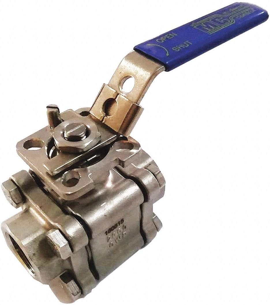 'Choose this ball valve from Navco when you need control and leak protection. This top-of-the-line ball valve is equipped with a 3-piece valve structure. It also has an inline body style and a FNPT x FNPT connection. The body is made of cf8m stainless steel material. The ball valve has a maximum pressure of 2000 psi CWP. It includes a full port. The handle is made of 316 stainless steel with pvc grip material. The handle type is: locking lever. It fits a pipe size of 1. It has a positive retained stem made of 630 Stainless Steel. The seat is made of PTFE material. The ball is made of 316 Stainless Steel. The temperature range is from -20 degrees to 500 degrees F. Features of this ball valve include: iso mounting pad. Standards include: ASME B16.34'