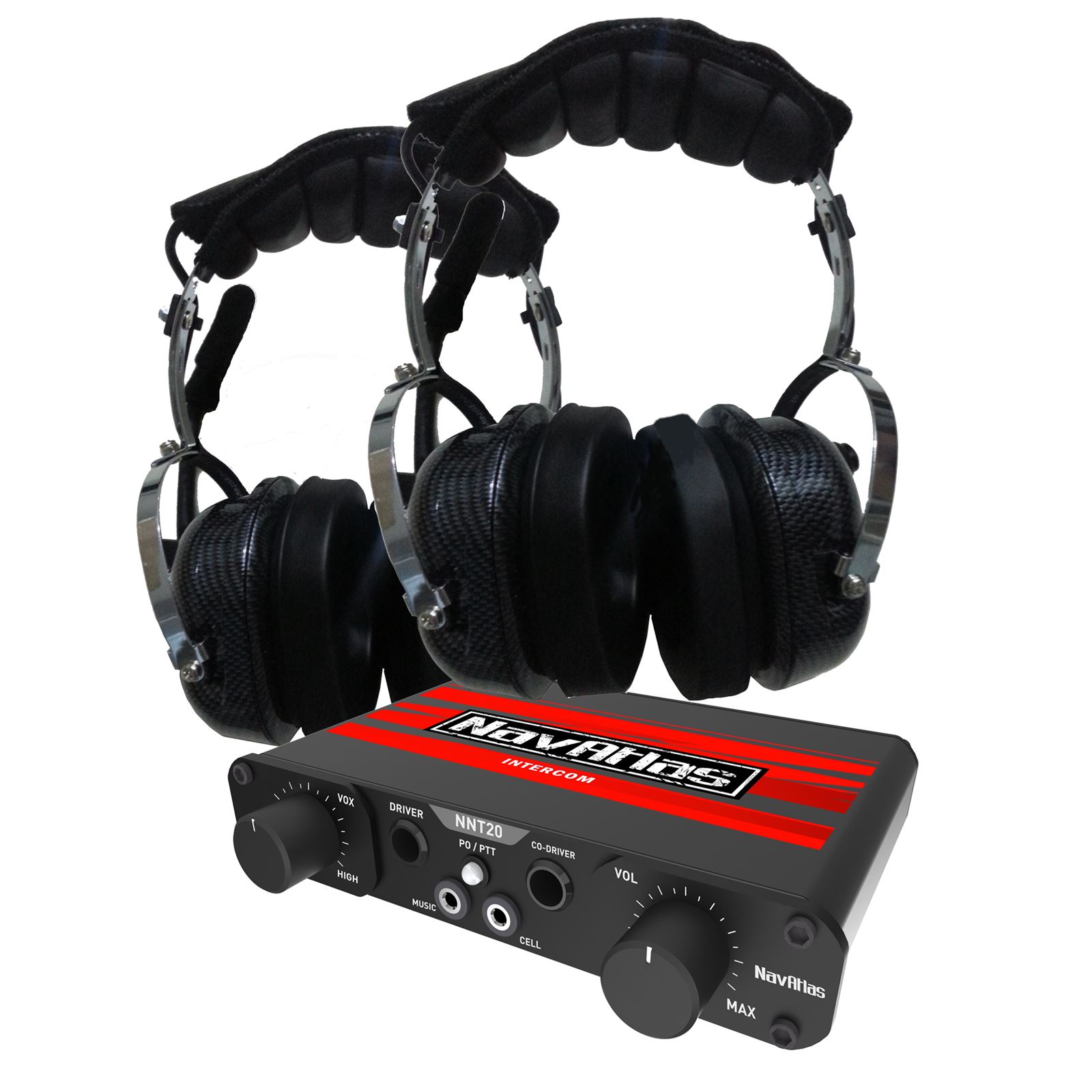 NavAtlas NI0230PK - NNT20 Intercom System with 2 pairs of NO300 Over The Head Headphones Note: Additional Headphones need to be purchased to allow all four users. This package includes headphones for two users. Features: NNT20 Car to Car Radio size 2-4 person Intercom High Fidelity Stereo Sound for Smart Phone or other Music Source VOX (Voice Activation) Separate Front Inputs for Music & SmartPhone Ready for Car to Car Radio or Handheld Radio Audio Output 2 Front Headphone Inputs (Front of Unit) 2 Rear Headphone Inputs (Back of Unit) RF Shield Housing High Level Output for Headphones for Sound Quality Dimension: 1.6” H x 4.5” W x 4.3” D NO300 Over The Head Headset Noise Cancellation Smart Mic High Fidelity Bass Enhanced Speakers (Stereo) Flexible Position Mic for VOX (Voice Activation) Carbon Fiber Finish Deluxe Ear pads Extra Padded Head strap Compatible with HCR16 and HEC10 to extend