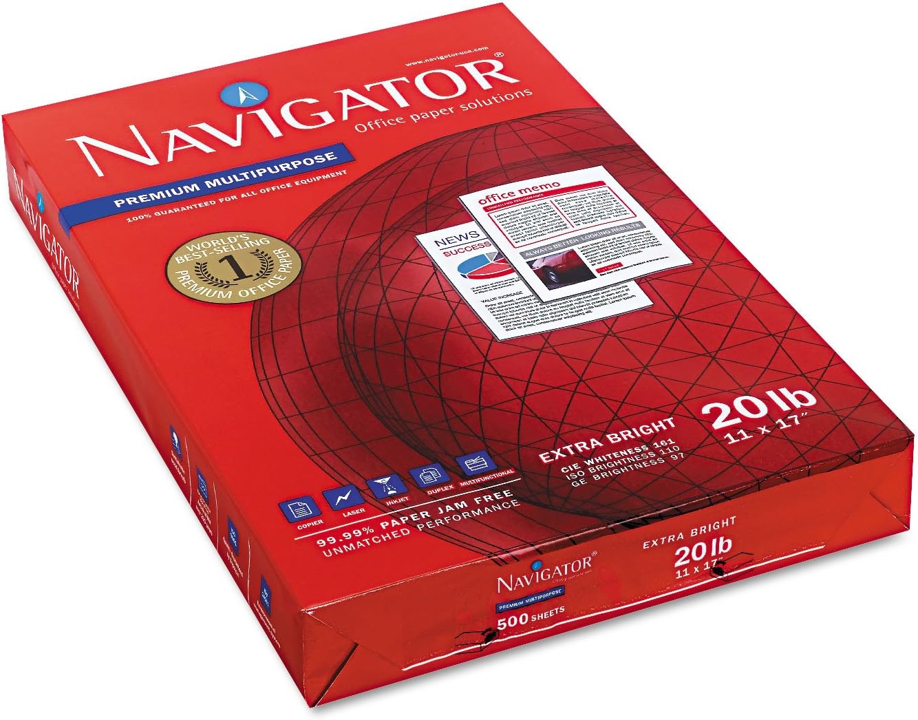 For everyday inkjet and laser printing, Navigator premium-quality multipurpose paper has you covered. Special engineering helps you render crisp, high-contrast text and images. Smooth finish provides excellent jam resistance. Size: 11 x 17; Paper Color(s): White; Paper Weight: 20 lbs.; Sheets Per Unit: 2500.