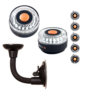 Portable Navilight 360° 2NM - White w/Bendable Suction Cup MountThe Navilight 360° 2NM - US Coast Guard approved for 2 nautical miles is the most versatile light of Navisafes range of battery operated portable navigation lights and includes a 360° All-round light, 225° Masthead light, 135° Sternlight, Flashing light, Anchoring light and a Cabin light. It uses super bright LED light, is waterproof, floats and attaches almost anywhere through its double magnetic mounting system.Examples of Usage:*Based on the Convention of the International Regulations for Preventing Collisions at SeaOn a power-driven vessel underway of 12 meters or more in length but less than 50 meters in length:SternlightAll-round white lightOn a power-driven vessel underway of less than 12 meters in length:Masthead lightSternlightAll-round white lightOn a power-driven vessel underway of less than 7 meters in length whose maximum speed does not exceed 7 knots:All-round white lightRowing/Paddle VesselsAll-round white lightAnchored vessels and vessels agroundAnchor lights must always be shown from sunset to sunriseAll-round white lightSpecifications:USCG Approval, 2 Nautical Miles5 Modes: 360° All-round light, 225° Masthead light, 135° Sternlight, Flashing light, Anchoring light, Cabin lightFloatable, waterproof (20 m) and air-tightIncludes magnet bracket, mounting screw, 3 lanyards for multiple fixing and securingPowered by three AAA batteries (not included)Size: H = 35 mm, Diameter = 68 mmWeight (net): 113 gModes / approximate burn time:<