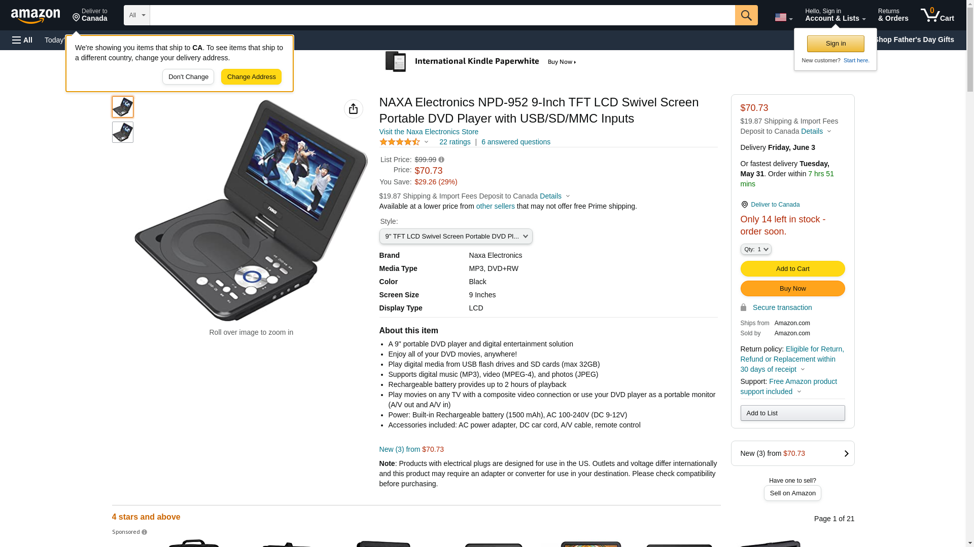 | Feature | * 9" Widescreen LCD Display * Top Loading DVD Player * Up to 180 Degrees Swivel Screen * Built-in SD/MMC Card Slot * Built-in USB Input * Built-in Speakers * Screen Mode: Wide (16:9) * Audio/Video Jacks * Earphone Audio Jack * Audio/Video Cable * Full Function Remote Control * 3 Way Power: UL/ETL Approved AC Adaptor, Built-in Rechargeable Lithium Battery & DC 12V Car Cord |
