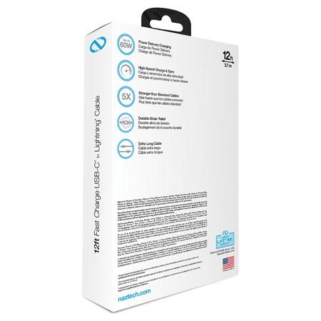 Naztech USB-C to Lightning Charger Cable [12ft, Apple MFi Certified] Power Delivery Fast Charging & Data Transfer Rounded Cable Compatible with iPhone 14/13/12/Pro Max/Pro, iPads & More [Black] 15374