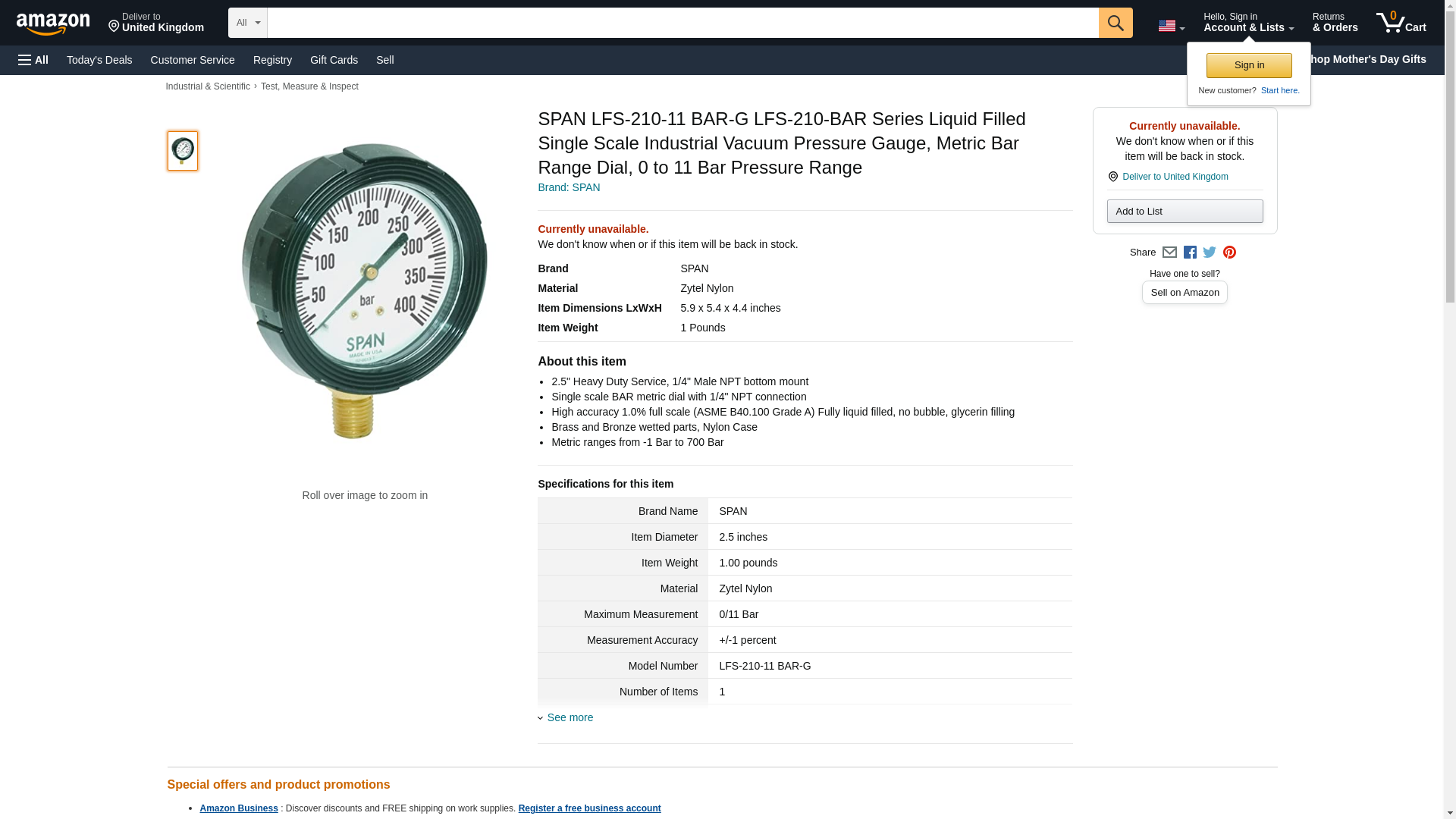SPAN LFS-210-11 BAR-G LFS-210-BAR Series Liquid Filled Single Scale Industrial Vacuum Pressure Gauge, Metric Bar Range Dial, 0 to 11 Bar Pressure Range