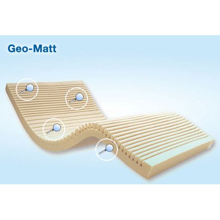 The #1 selling therapeutic overlay in the US, Geo-Matt is used by thousands of hospitals and nursing homes nationwide. It has been proven effective in clinical trials and studies as an aid in the prevention and treatment of pressure ulcers.The top surface is cut using our exclusive Geo-Matt design, which creates more than 800 individually responsive foam cells that are anatomically sized to the area of the body they carry. This zoned design delivers the ideal support characteristics needed at the head, torso, and lower extremities. By independently absorbing pressure points, the cells allow the Geo-Matt to customize its support to the body's natural curvature while minimizing the effects of pressure and shearing. In addition, Geo-Matt's exclusive "Ring-of-Air " feature helps to ventilate the surface, channeling heat away from the patient to minimize perspiration build-up.GeoMatt Cut Foam Top: The Geo-Matt style foam topper is a high density, medical grade foam. The unique geometric design consists of over 800 individual cells, each of which acts individually to redistribute pressure, to reduce heat and moisture buildup on the skin, and to reduce shear to underlying tissues. This foam overlay is 3.5 in height.Upper head section and lower foot section: Cells are smaller at the head and foot section to disperse pressure over these sensitive areas.Body Section: Cells are larger to provide pressure dispersion over the torso.Inset of Geo-Matt Close-Up: The unique Ring-of-Air performs several functions. It allows each cell to act individually to conform to the body. It assists in removing heat and moisture from the body by channeling heat and vapor away. And it reduces shearing by allowing the individual cells to move independently, reducing pull on the skin.SpecificationsWeight Limit: 250 lbsStandard Sizes: Full (Double - 52"W x 72"L); Queen (58"W x 75"L) & King (74"W x 75"L)1 Each / Each