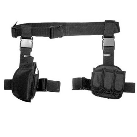 3 Piece Drop Leg Holster/Mag Holder<br /><br />Features:<br /><br />- Constructed of Tough PVC Material<br />- Molded Universal Holster fits Most Standard Size Pistols<br />- Three Magazine Pouches on Left Side<br />- Fully Adjustable Belt and Leg Straps.<br />- Right Handed Only.<br />- Material: 600X300D PVC<br />- Waist Size for Belt: 30I"-42"<br />- Color: Black