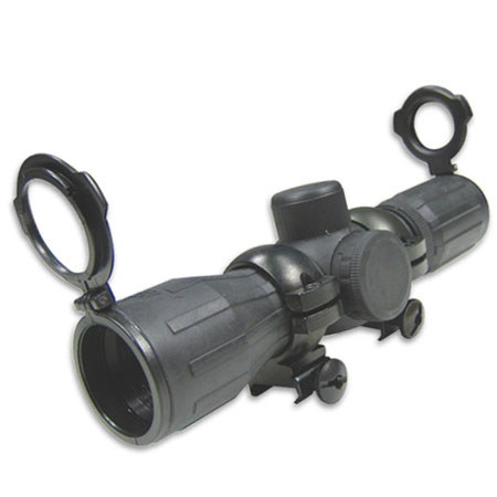 Features: One piece aluminum main tube with rubber outer coating Multi Coated Lenses Reticles illuminate Red or Green with multiple brightness settings Includes built in lens caps and either aluminum weaver style rings Specifications: Magnification: 4X Tube Dia.: 30mm Objective Dia. (mm): 30.00 FOV (Feet @ 100 yds:) 26.2 Eye Relief (in): 3 Exit Pupil(mm): 7.5 Reticle: P4 Sniper N.W(OZ.) 13 Length (in): 7.48 Click Value: 1/4 M.O.A Exterior Finish: Rubber Coated Lens Coating: Ruby Mount Included: Weaver Style Rings
