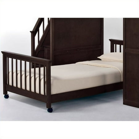 The Stair Loft Lower Bed is designed to fit underneath the Loft and is equiped with locking casters ensuring this bed is easy to make and care for. Mattress ready with complete slat system (no foundation required); Bed is on locking casters allowing for ease of making the bed and cleaning of the space around it; Material: Hardwood & Veneer; Loft bed is mattress ready and sits on locking casters for easy cleaning ; You can order this loft as a twin or full size bed. ; Chocolate finish. Specifications:Overall Dimensions (Twin): 25.5" H x 42.25" W x 80" D ; Overall Weight (Twin): 56 lbs; Overall Dimensions (Full): 25.5" H x 58.3" W x 80" D; Overall Weight (Full): 78 lbs.