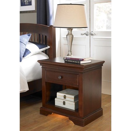 Includes a nightlight built into the bottom. Single drawer over a large open cubby. Three-outlet charging station (power strip) is built into the back of the nightstand. Ideal place for plugging in lamps, clocks or chargers. Nightlight built into the bottom with three separate intensities. Light is easily controlled by a low voltage sensor centered under the drawer and at the bottom of the parting rail. Felt lined top drawer. English dovetail joinery at the front and back of the drawer. Full extension, side mounted and ball bearing drawer guides. Solid iron drawer pulls in oil rubbed bronze. Made from poplar solids and cherry veneers. No assembly required. 24 in. W x 16 in. D x 24 in. H. The Walnut Street Collection case goods have the strength and grace to stand the test of time. Designed with generous proportions, precision moldings and modern details, the NE Kids Design Team has truly given a fresh update to 19th Century Louise Phillipe styling and created a masterpiece all there own.