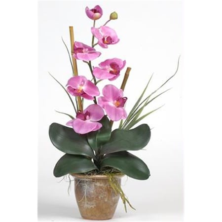 Bursting with color and personality the Phalaenopsis is perhaps the most popular variety of all the orchids. Six lively blooms and two buds are complemented by genuine bamboo, which enhances the silk plant's authenticity. Featuring nearly natural leaves, moss and roots, this familiar favorite is sure to charm the masses.