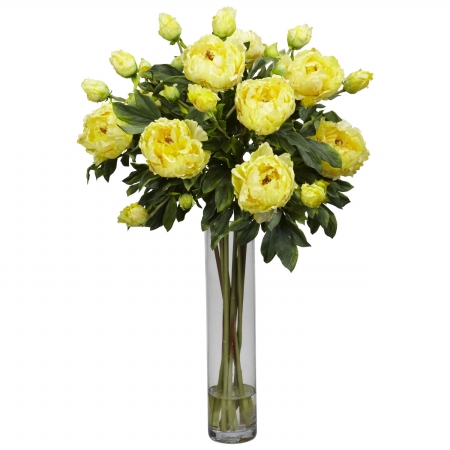 Nearly Natural 1230-YL Peony with Cylinder Silk Flower Arrangement, Yellow