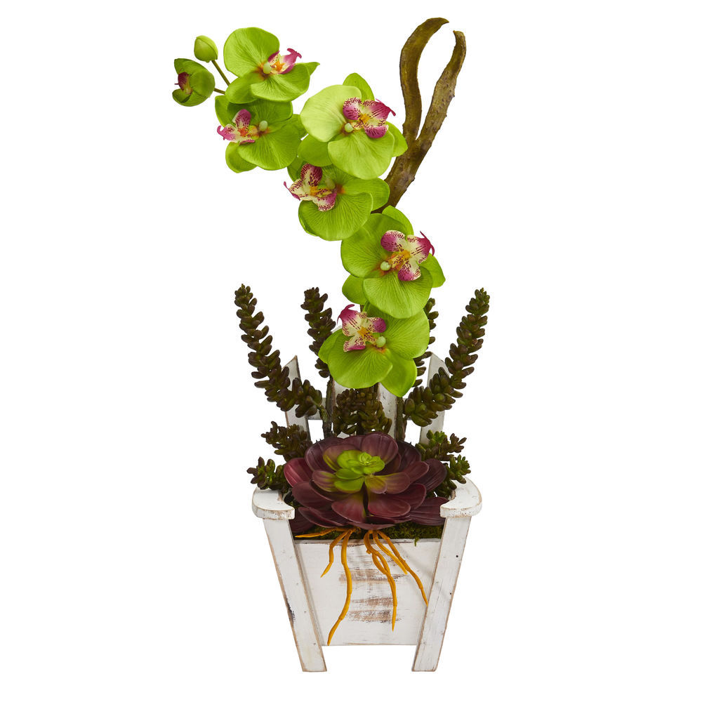Nearly Natural Phalaenopsis Orchid & Succulent Artificial Arrangement In Chair Planter Green