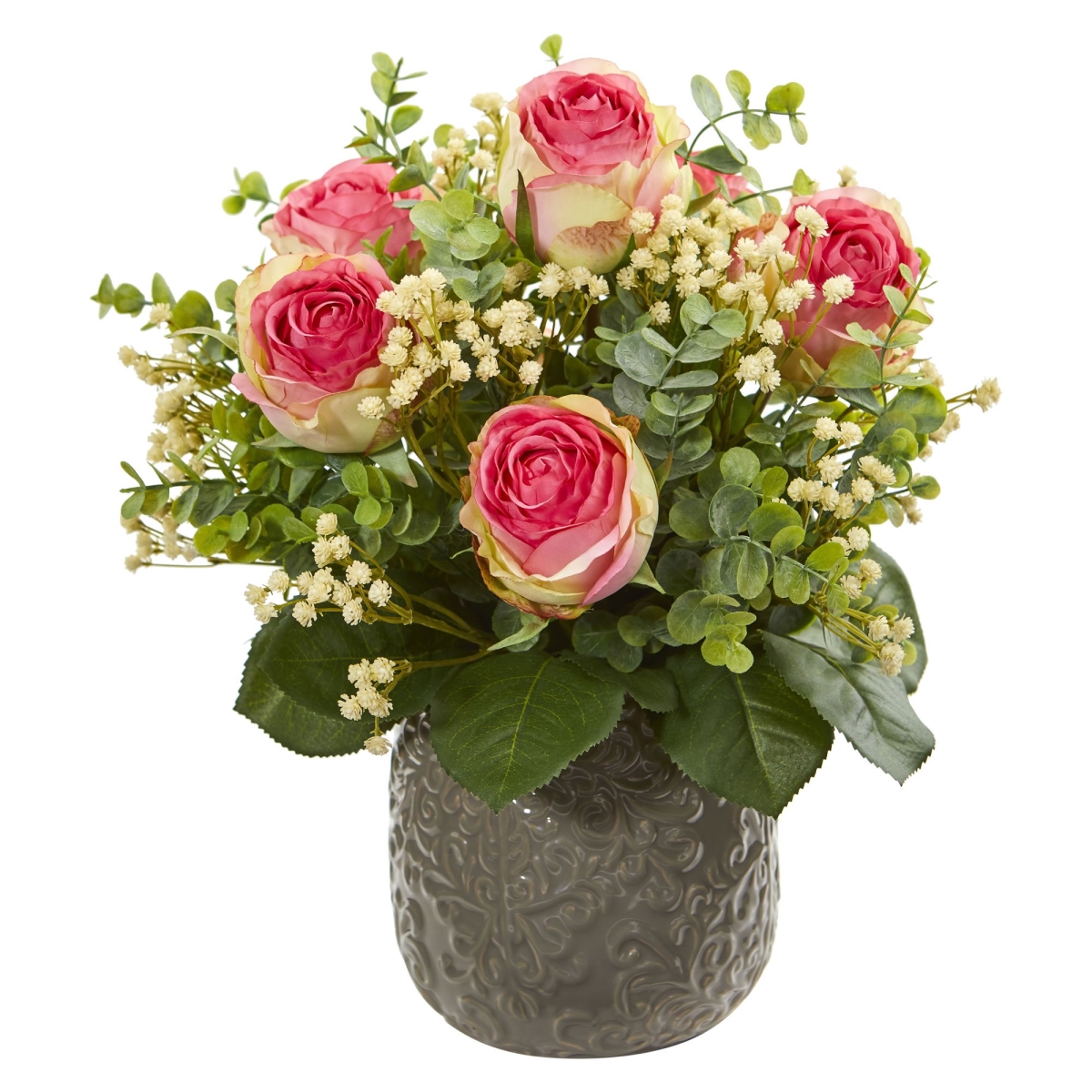 Nearly Natural 14in Rose, Eucalyptus, Gypsophillia Artificial Arrangement