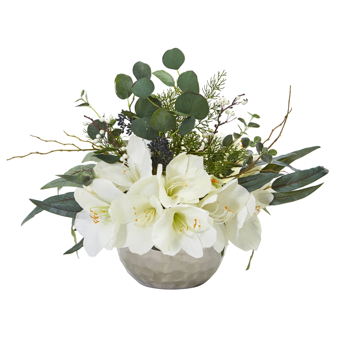 Nearly Natural 1925-WH Amaryllis & Eucalyptus Artificial Arrangement in Silver Vase - White