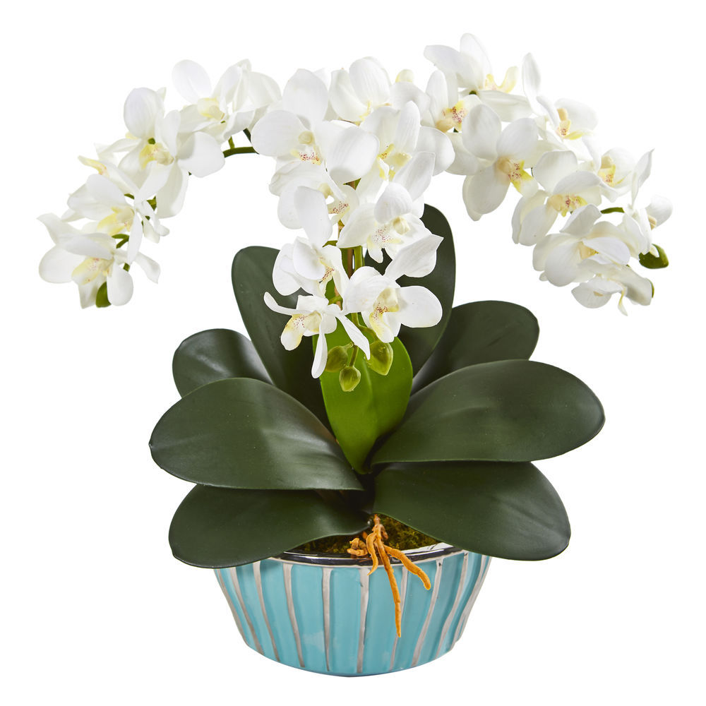 Nearly Natural 14in Phalaenopsis Orchid Arrangement in Turquoise Vase