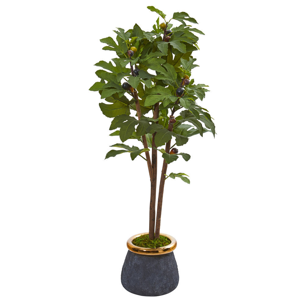 - Incorporate forest greenery with this artificial fig tree showcasing a collection of lush Green foliage atop textured Trunks. Stands 46in. High from a planter accented with brass trim.