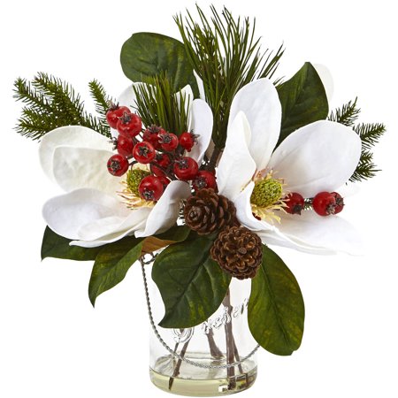 <br /> <b>Magnolia, Pine, and Berry in Glass Vase:</b> <ul> <li>Silk magnolia petals</li> <li>Realistic pine needles</li> <li>Dimensions: 12"H x 13"W x 11"D</li> <li>Bright red berries</li> <li>Faux water</li> </ul>
