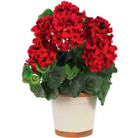 Make a bold splash thing spring (or any season) with this grand red geranium arrangement. Standing 17 in. high with six full blooming petals that stand in sharp contrast to the lush green backdrop, this arrangement will bring a smile to face of anyone looking at it. For added authenticity, we?ve included several of the ?smile? leaves that this plant is known for.