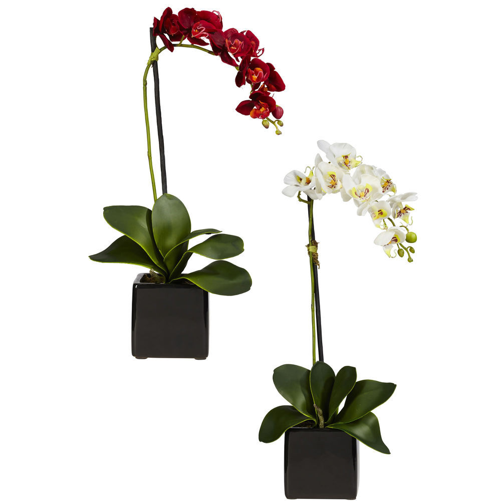 Nearly Natural 4757-S2 Phaleanopsis Orchid with Black Vase Decorative Silk Arrangement, Red and White, Set of 2