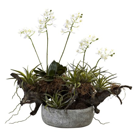 Nearly Natural 4839 Orchid and Succulent Garden Floral Arrangement Set with Driftwood and Decorative Vase, Green