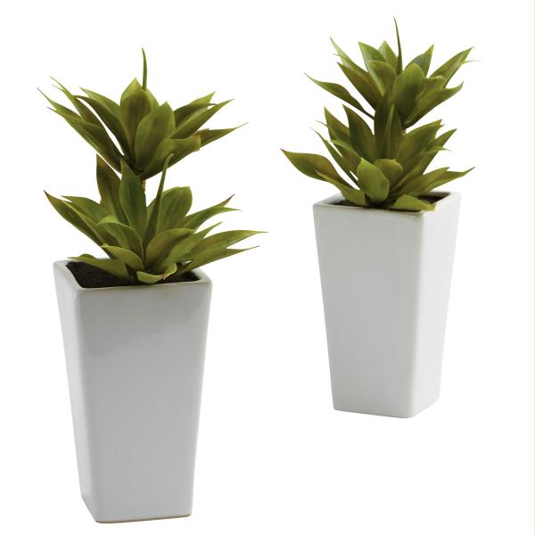 The Agave is one of nature's more interesting specimens, as it's equal parts lush, delicate, and full-bodied. The pointed leaves seem to rise out from each other, making an almost perfect cup. This set of faux Agaves captures that look perfectly and sets them in a pair of beautiful white planters. Makes a great addition to any home or office decor.