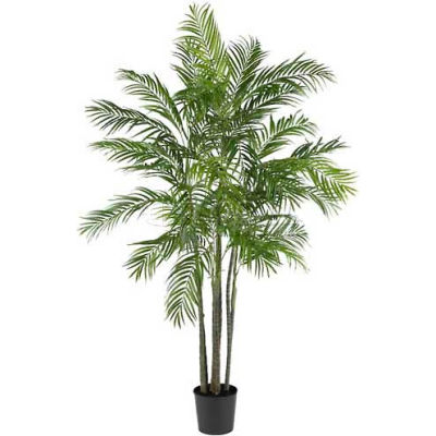 The Nearly Natural 6 ft. Areca Palm Silk Tree is a perfect accent for a wide variety of home and office decor styles. The tree stands 6 ft. tall and has over 1,300 leaves that are made to help ensure an organic appearance. It comes nestled in a plastic planter and surrounded by soil for aesthetic appeal.