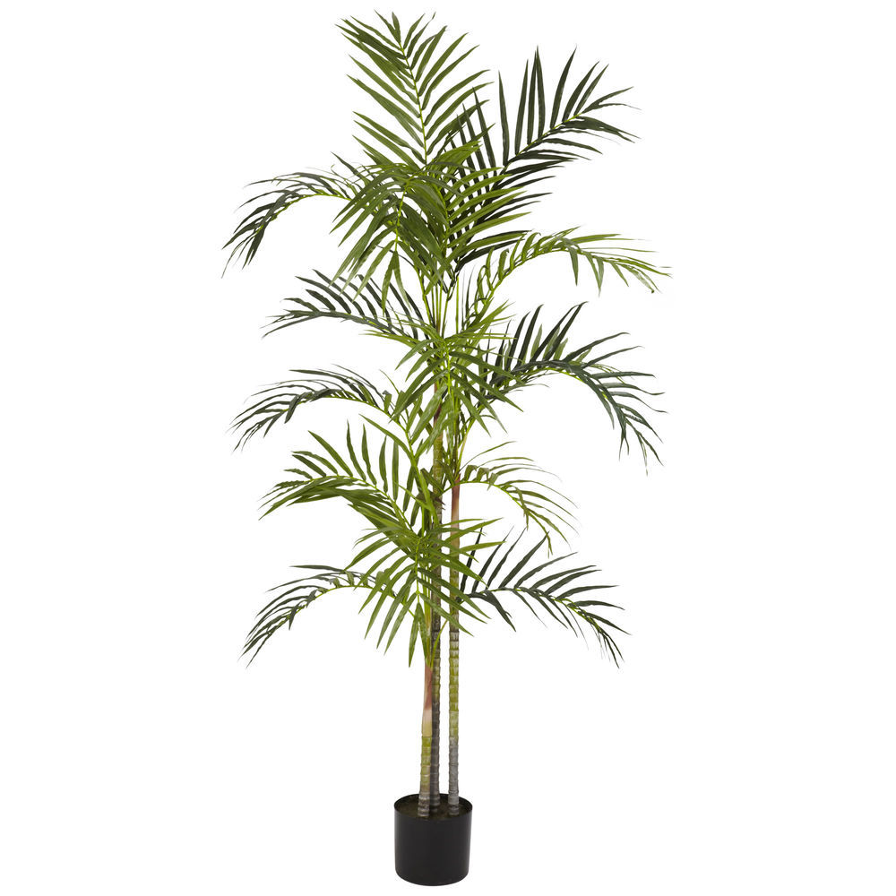 Reaching 5 ft. high, the Areca Palm Tree arrangement is 4 trees with over 438 beautifully rich green leaves cascading out of the center in a fountain of greenery. The long leaves create interesting geometric patterns to enjoy from any direction. Best of all, there?s no need for water or upkeep. Just enjoy the fountain of beauty. Comes with a pot and faux soil.
