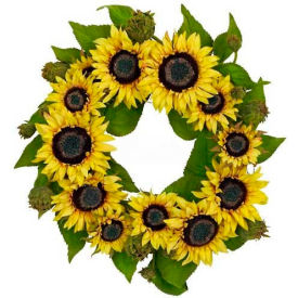 Wherever you hang this bright, cheery 22 in. sunflower wreath, it?ll feel like a sunny day (no matter what the weather outside is) With beautiful, bursting sunflowers circling endlessly on a sea of greenery, the warmth and good feelings just radiate forth. Yes, it?s going to be summer year-round?. Buy one for your home, and one as a ?sunny? gift for a friend or loved one.