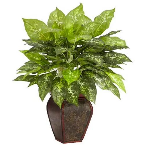 The Dieffenbachia is a favorite addition to any home or office due to its large, stylish leaves, which also sport simple yet beautiful patterns along their rich, green surfaces. With a star-like cascade of foliage bursting out of an elegantly designed textured brown vase, this traditional favorite is sure to add a burst of life to any environment.