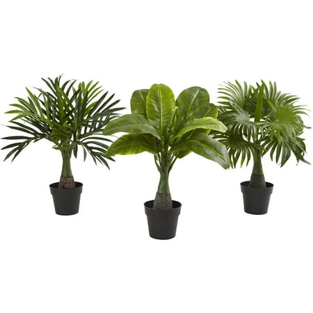 <br /> <b>Nearly Natural Areca, Fountain and Banana Palm, Set of 3:</b> <ul> <li>Set of 3</li> <li>1 each of areca, fountain and banana palm planters included</li> <li>Dimensions: 15.5" to 16" high</li> </ul>