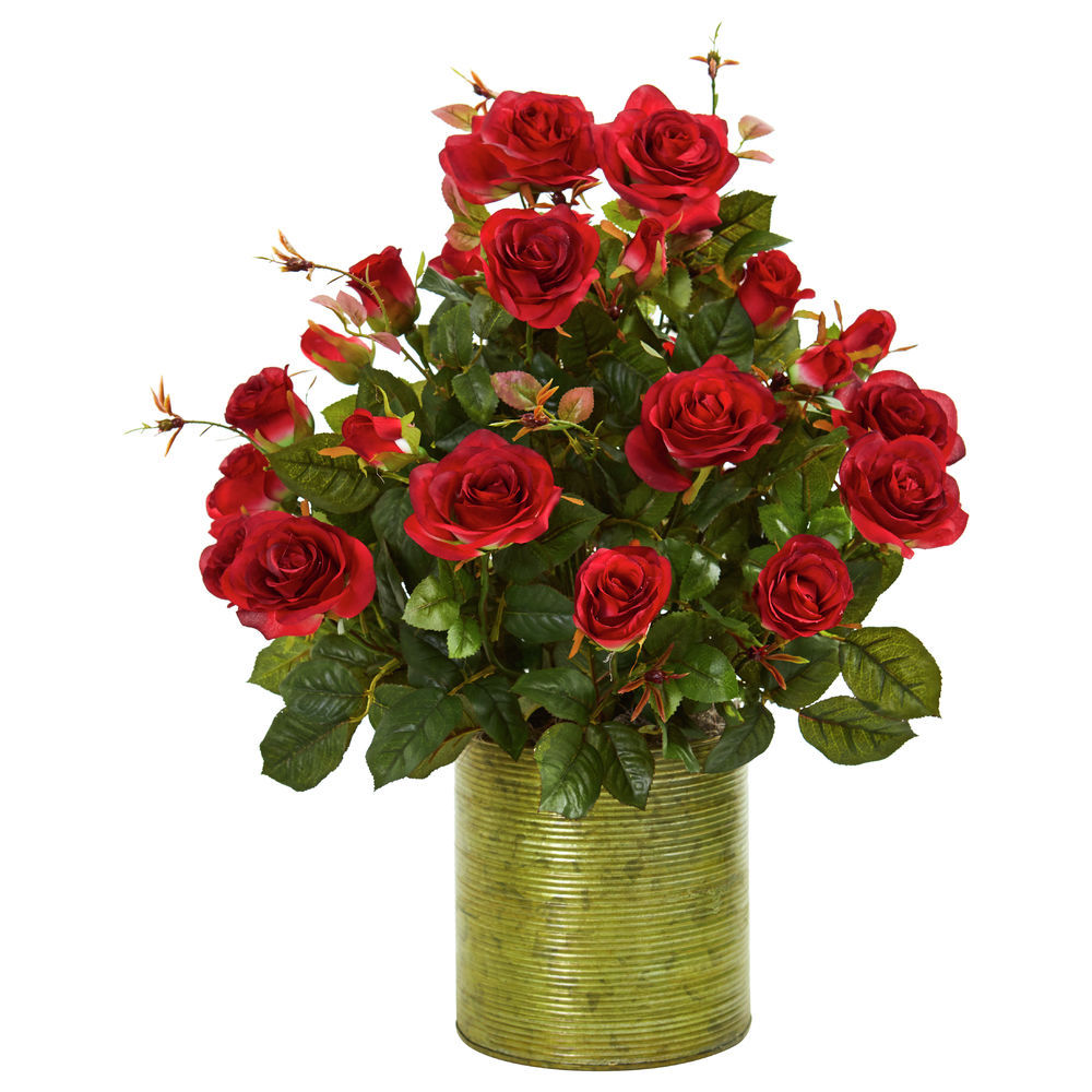 Nearly Natural Garden Rose Artificial Arrangement in Metal Planter Silk Plants, Red