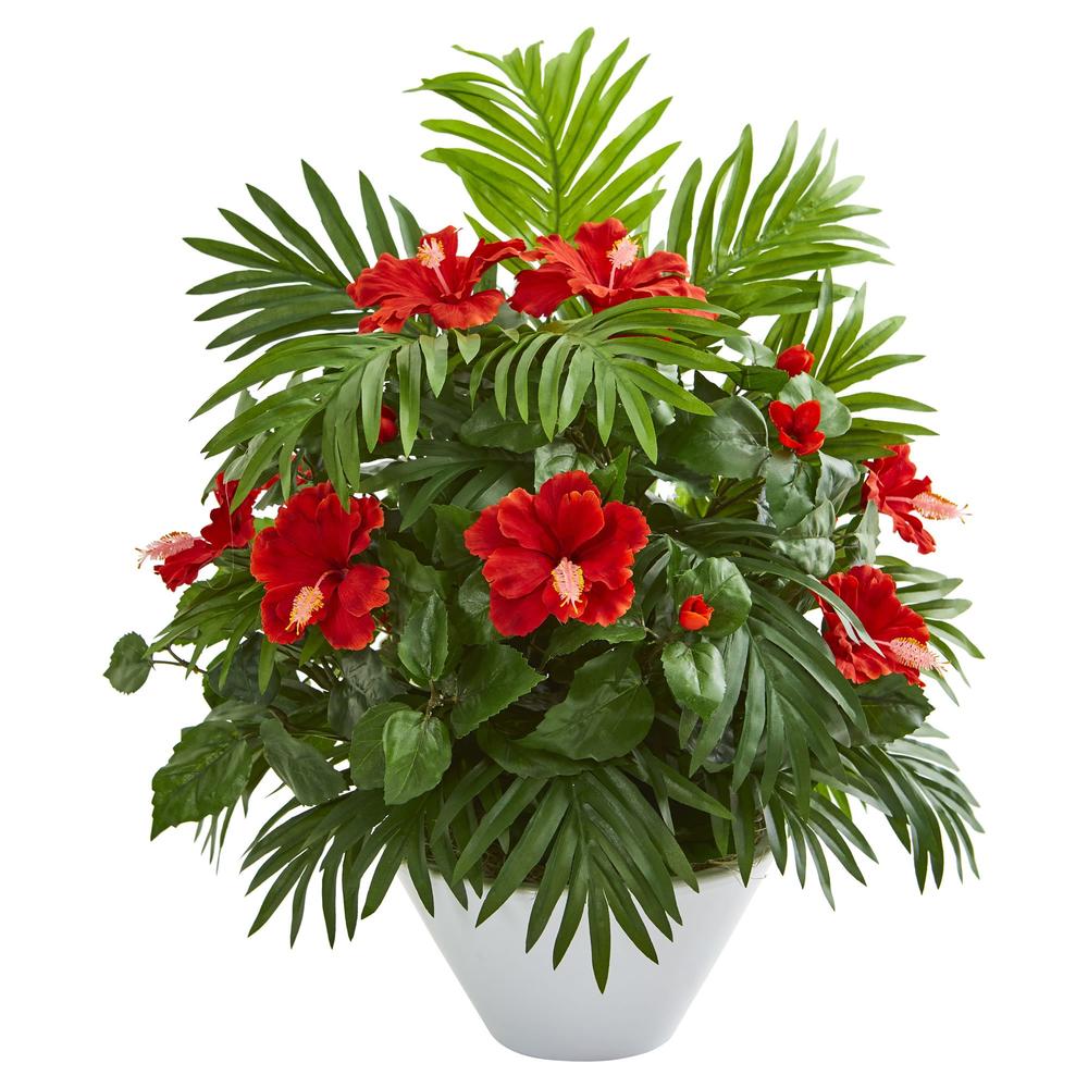 Nearly Natural Hibiscus and Areca Palm Artificial White Bowl Silk Plants, Red