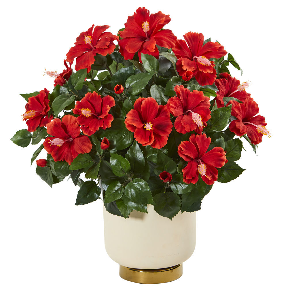 - Splash color into your interiors with this artificial Hibiscus plant flaunting Green foliage, highlighted with vivid tropical blooms. Standing 22in. Tall from a white bowl, It evokes an instant cheerfulness.