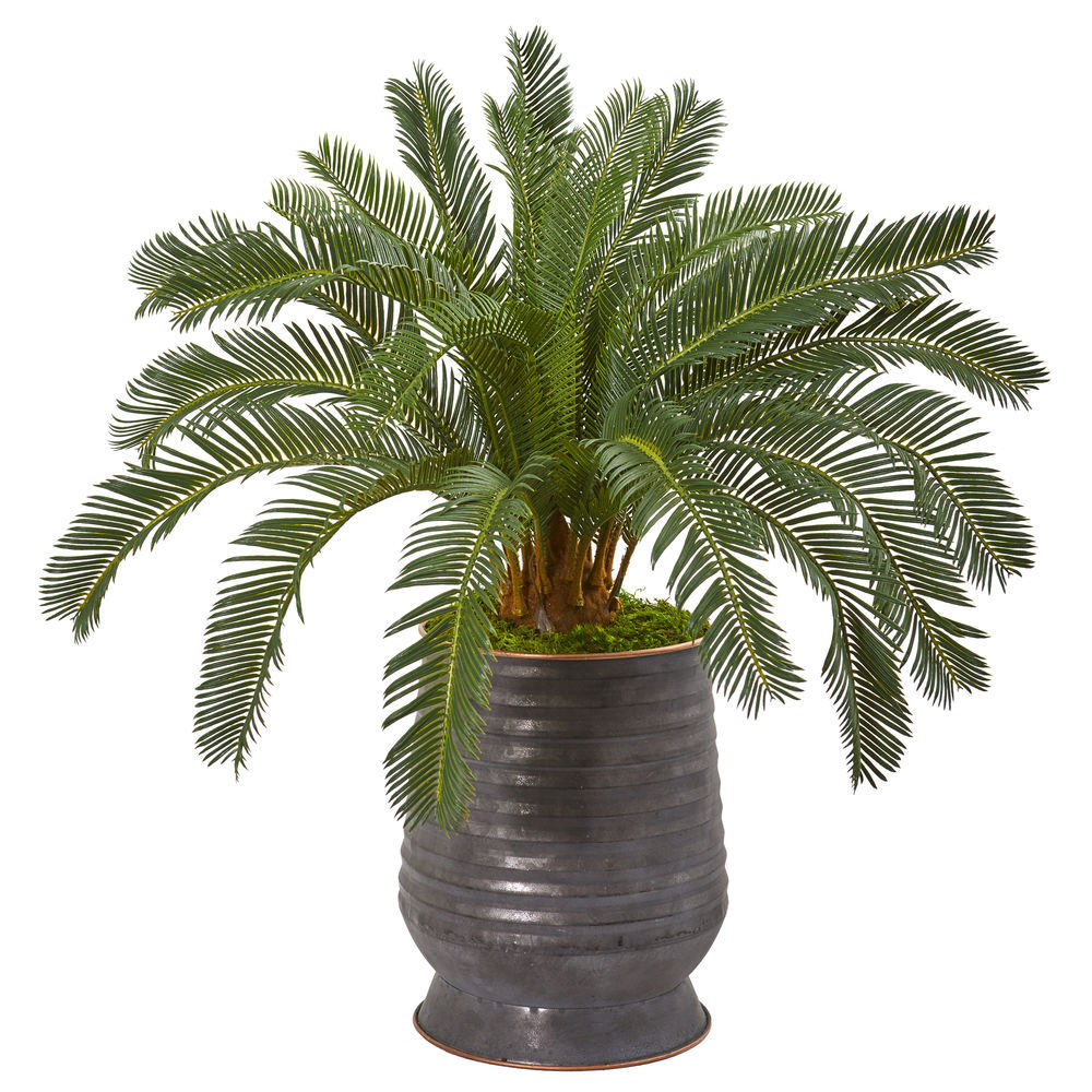 - This artificial cycas plant is rich in bright Green foliage that fans out from a ribbed metal planter with natural tone rocks.