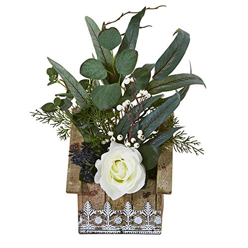 Nearly Natural 16in. Rose and Eucalyptus Artificial Hanging Floral Design House Planter Silk Arrangements, White