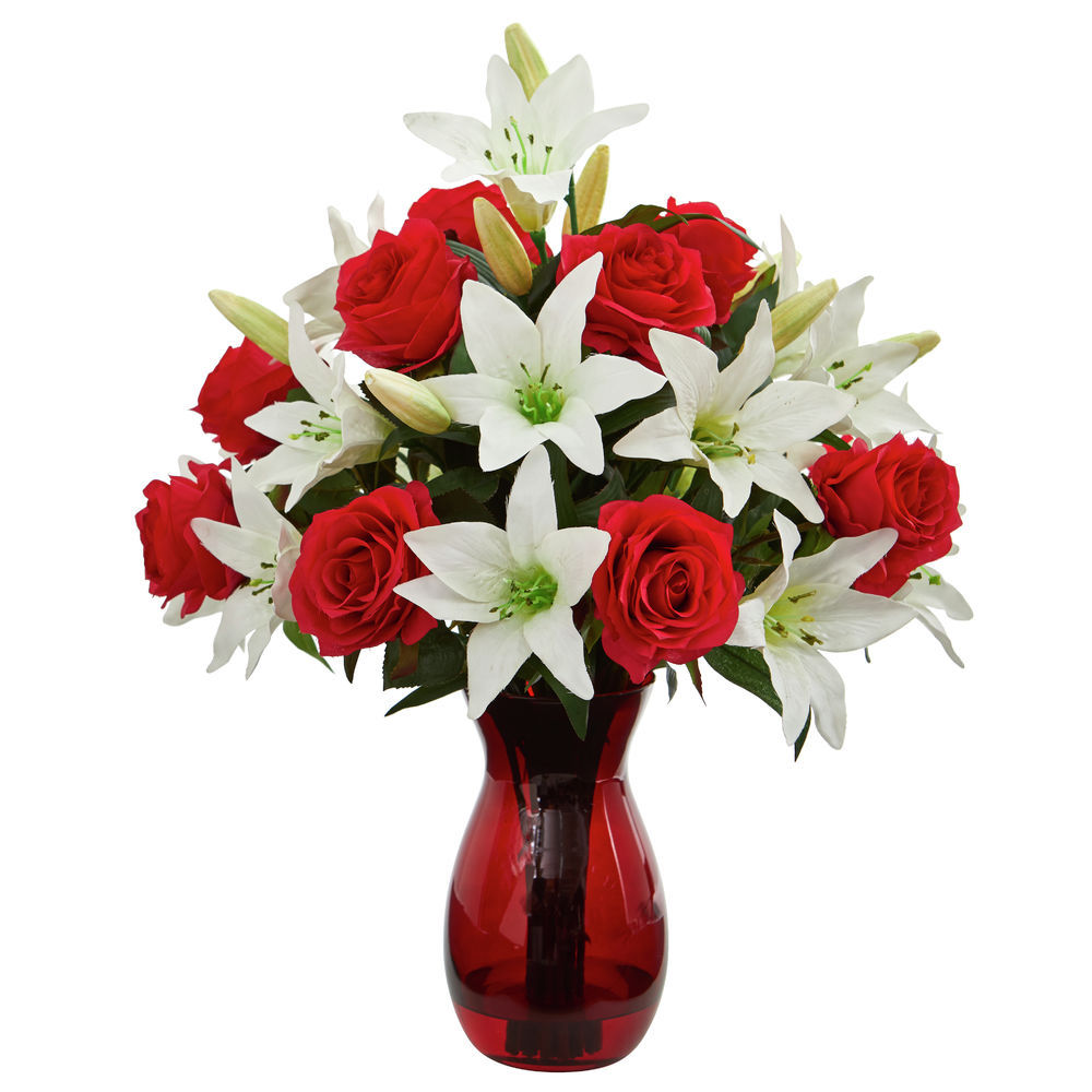 Nearly Natural Roses & Lilies Artificial Red Vase Silk Arrangements White