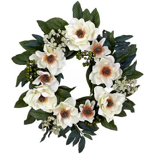 - HOME DECOR ACCENT: Looking for a decoration that’s soft, beautiful, and timeless? Then look no further than this beautiful magnolia wreath. Lovely greens (complete with “berries and buds”) twist and turn, creating the ideal backdrop for the billowy white blooms that spring forth. This makes for a perfect wall accent year round’, and also makes an ideal gift for that hard to buy for person.