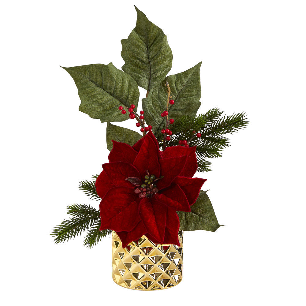 Nearly Natural 21 in. Poinsettia, Berries and Pine Artificial Arrangement in Gold Vase