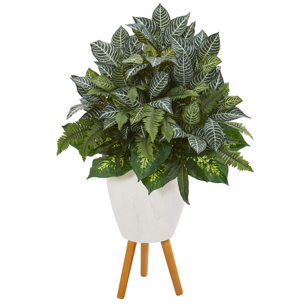 Nearly Natural 37in. Mixed Greens Artificial White Planter with Stand Silk Plants