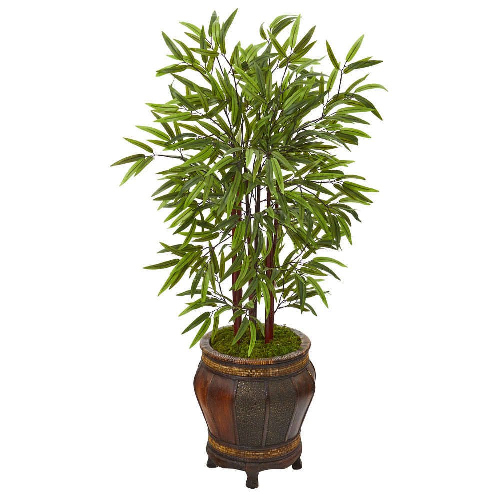 - Establish a relaxing environment with this artificial tree Boasting bamboo leaves realistically branching off from textured stems. Stands 50in. High from a decorative planter stabilized with natural Moss.