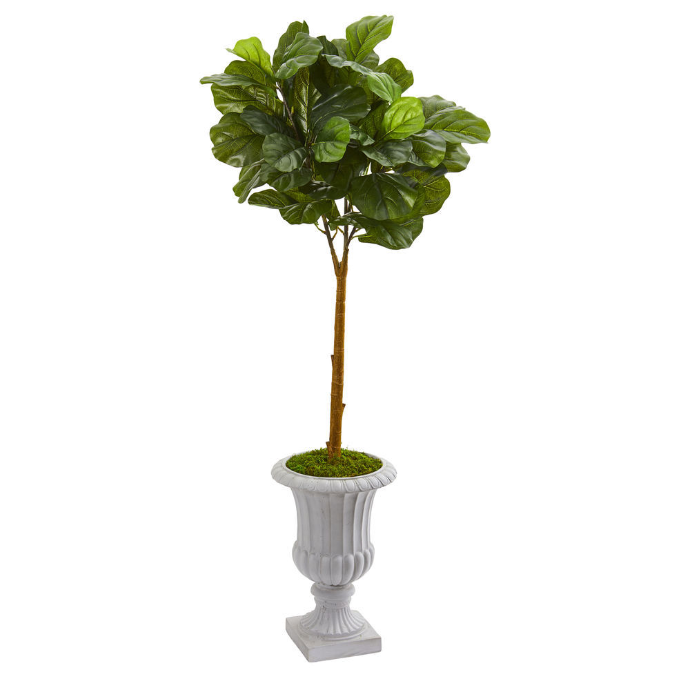 - Transform bare spaces with this artificial fiddle leaf tree boasting thick, glossy leaves in bright hues, sprouting atop a texturized trunk - all of which feel real to the touch. Stands 50in. high from a decorative urn.