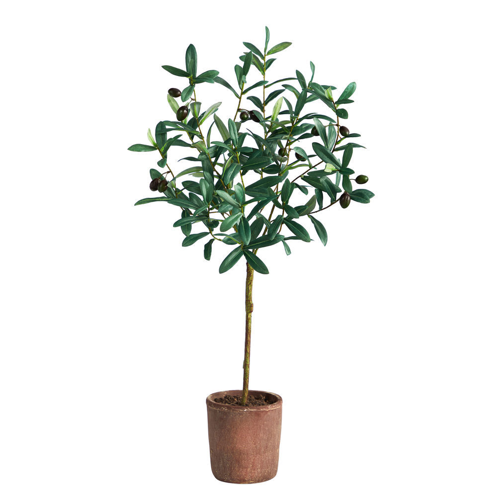 - Walk through the Italian countryside with this fine and delicate Olive Artificial Tree. Featuring a thin brown trunk that splits into stems, this fake tree elegantly displays faux leaves and is accented throughout with fake olives so realistic that you’ll want to eat them. Standing at 31" from a planter (included in height), curate in compact and tight spaces like apartments, awkward corners, and bathrooms.