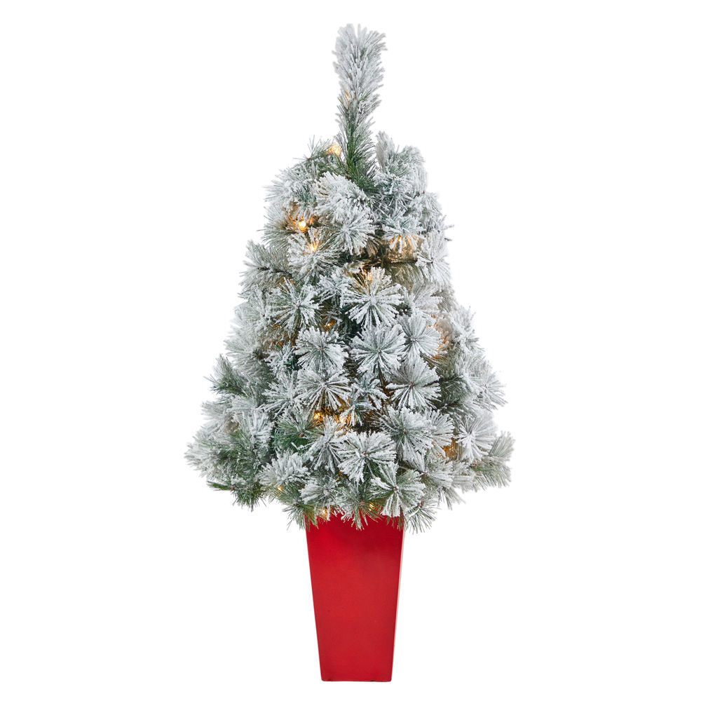 - SEASONAL DÉCOR ACCENT: If you’re dreaming of a white Christmas, look no further, this flocked Oregon Pine Artificial Christmas Tree makes your wish come true. Designed to mimic real evergreen foliage and texture, this mini artificial Christmas tree features 113 easy-to-bend branches. Pre-strung, with 50 clear lights, for a cozy feel - save time and money. Stands 44" from a red tower planter (height includes planter)