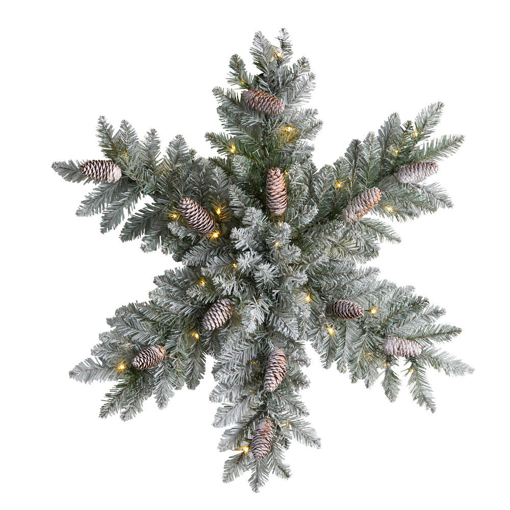 - Have some whimsical fun this holiday season with a Pre-Lit Flocked Snowflake Artificial Dunhill Fir Wreath with Pinecones. Be bold and different by displaying evergreens in a star shape inspired by nature that mimics real trees' foliage and texture. Pre-lit with 40 LED lights that are more energy efficient create a cozy scene with the family. Pinecones adorn the 120 bendable branches for a rustic look. With a diameter of 30in., house in any bare wall or door.